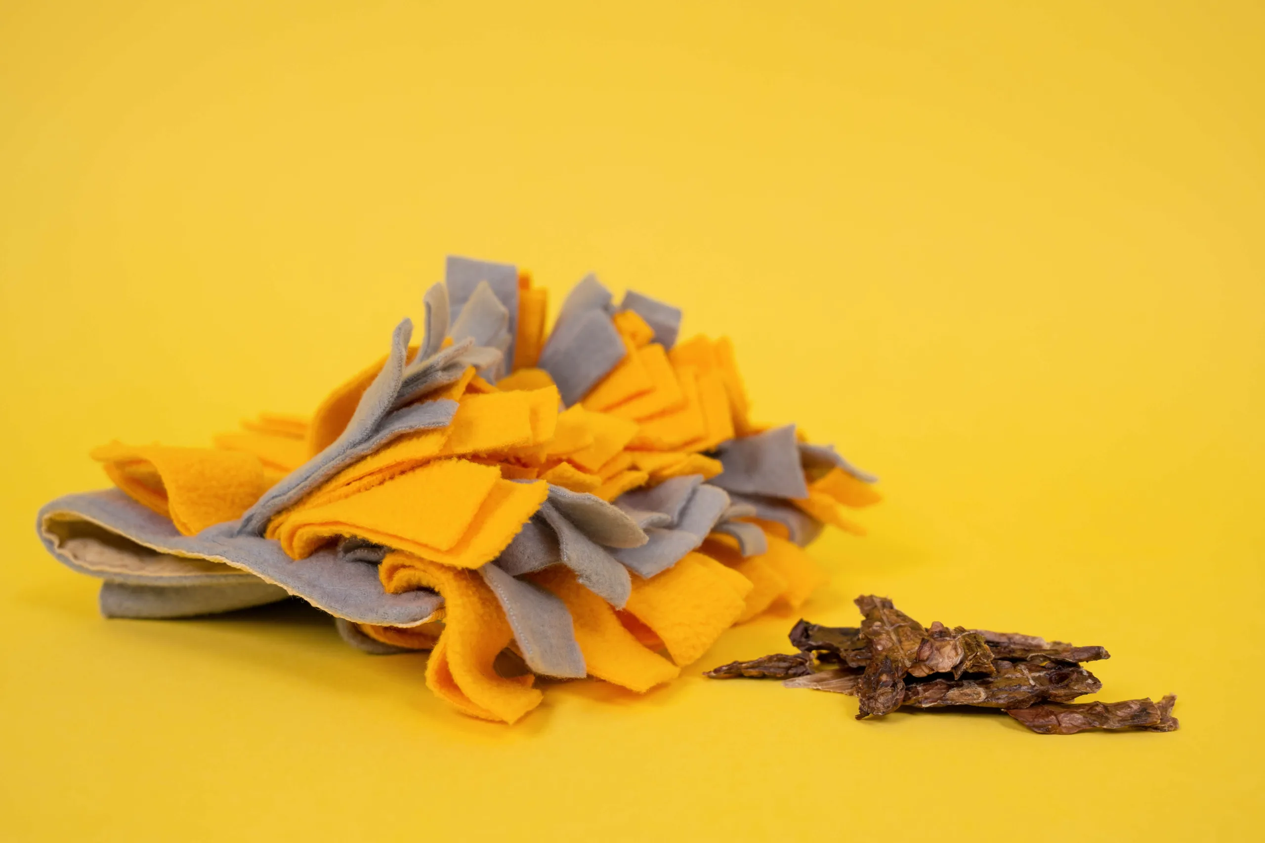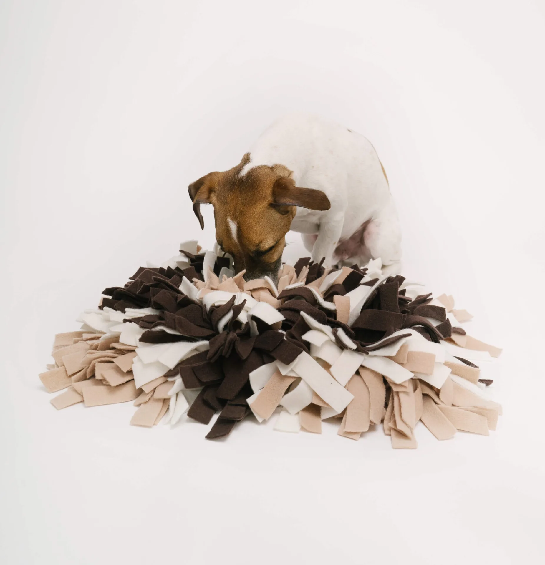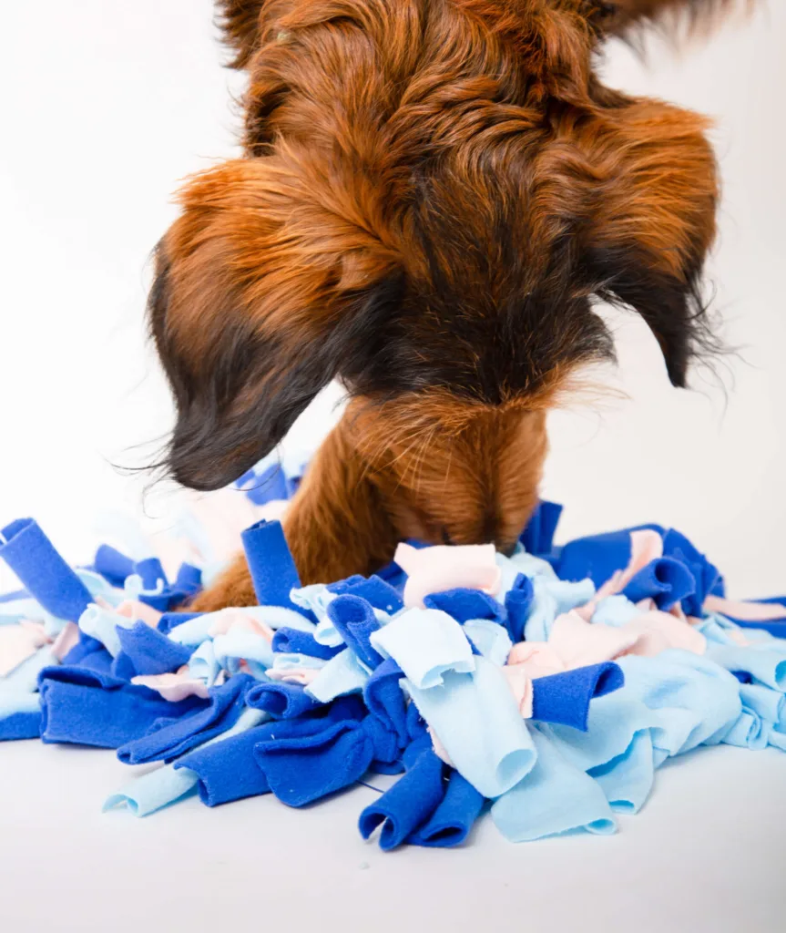 To kick things off, we’re introducing you to the Snuffle Mat. A Snuffle Mat is a cognitive, sensory, and food-based form of enrichment that involves a mat, often with a rubber base, and fabric strips that are knotted through the holes. While it sounds (and often looks) a little strange, it’s what’s inside that really counts. All these loose pieces of fabric provide a plethora of places to hide treats (and even kibble) and your dog will love sniffing them all out!