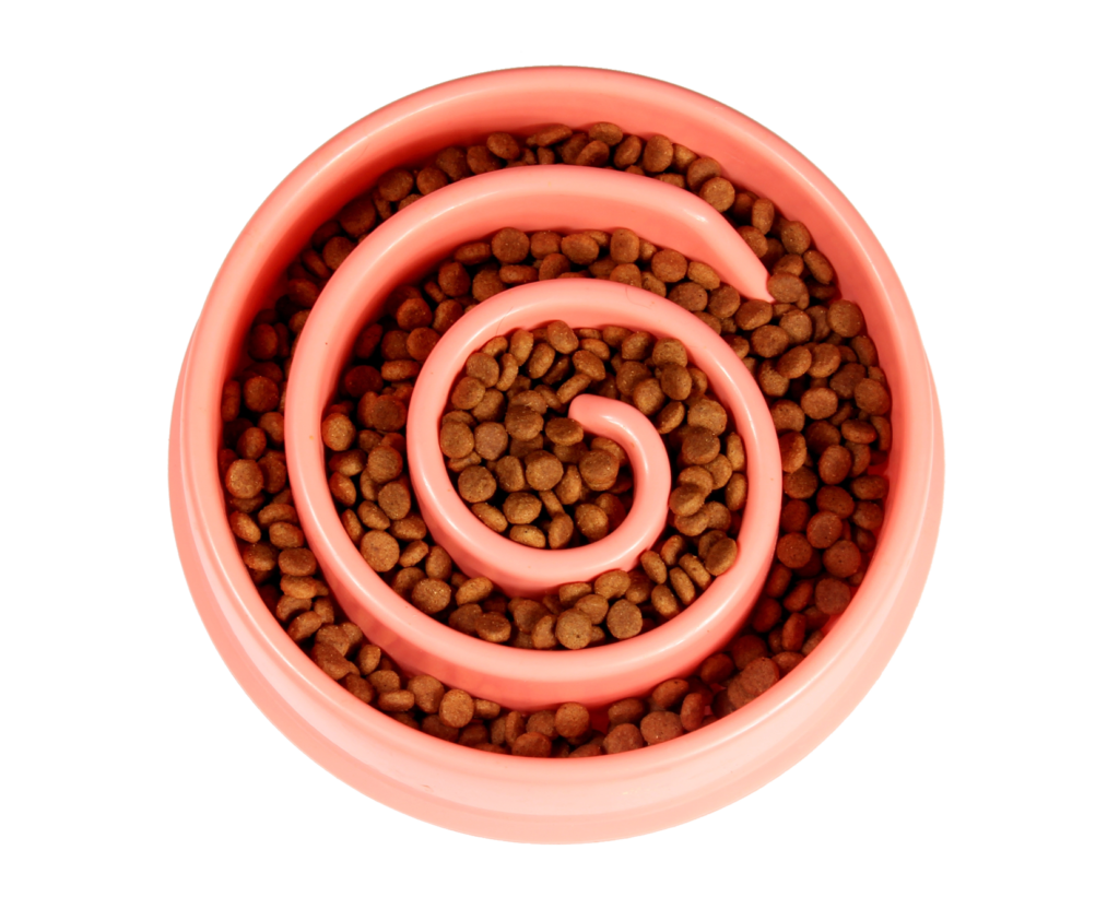 To slow your dog down, try using a slow-feeder bowl, which has ridges that make them work for their food. You can also spread their kibble on a flat surface, like a baking tray, or use a puzzle feeder to turn mealtime into a fun challenge. If your dog is very food-motivated, splitting meals into smaller portions and feeding them throughout the day can also help. Ensuring they stay calm before meals and don’t feel rushed can go a long way in preventing fast eating.