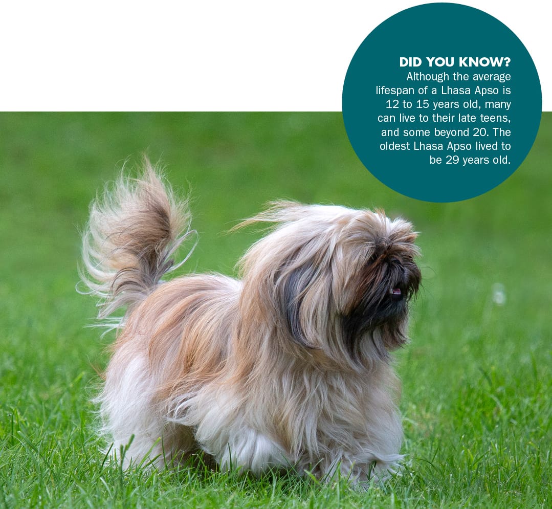 Lhasa Apsos are generally a hardy breed with a lifespan of 12 to 15 years, though many live even longer with proper care. Some common health concerns include hip dysplasia, progressive retinal atrophy (PRA), atopic dermatitis, and kidney issues. Regular veterinary check-ups and a balanced diet contribute to long, healthy lives.